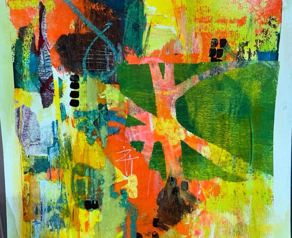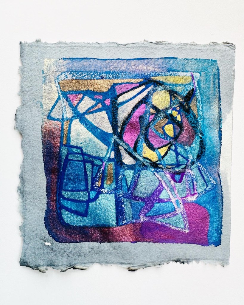 I work across paint, collage, ink, and textiles, following the rhythm and energy of the materials. Texture and contrast are central, creating surfaces that invite viewers to pause, explore, and discover hidden layers and connections.