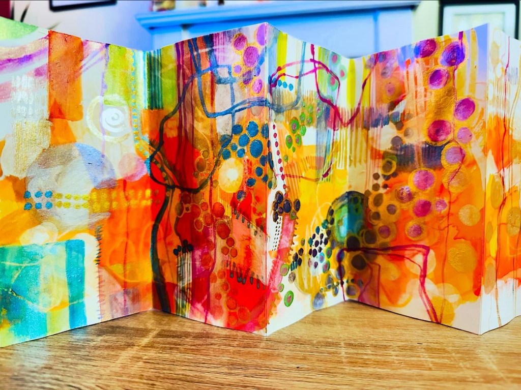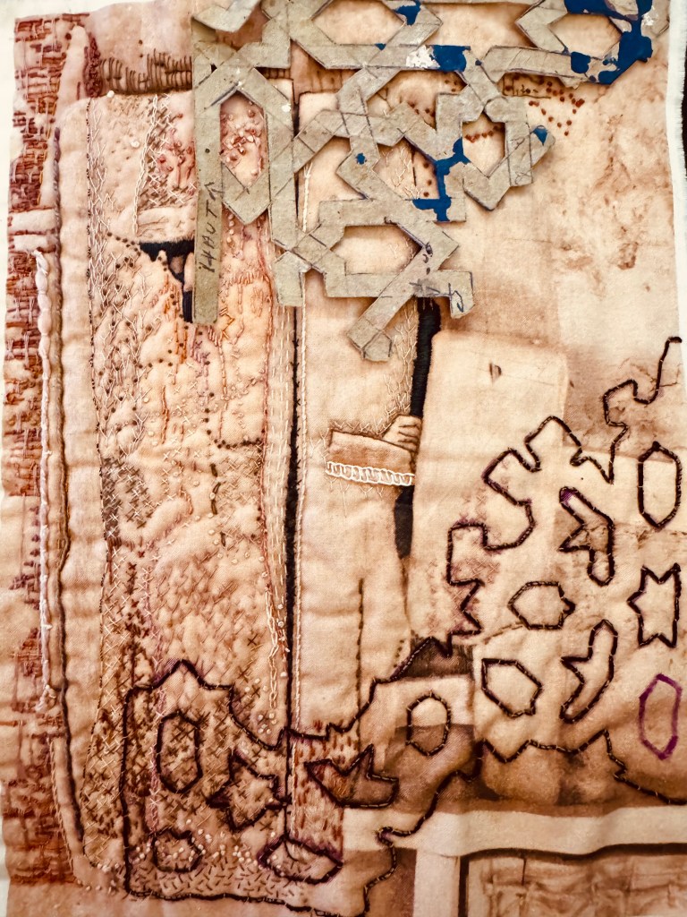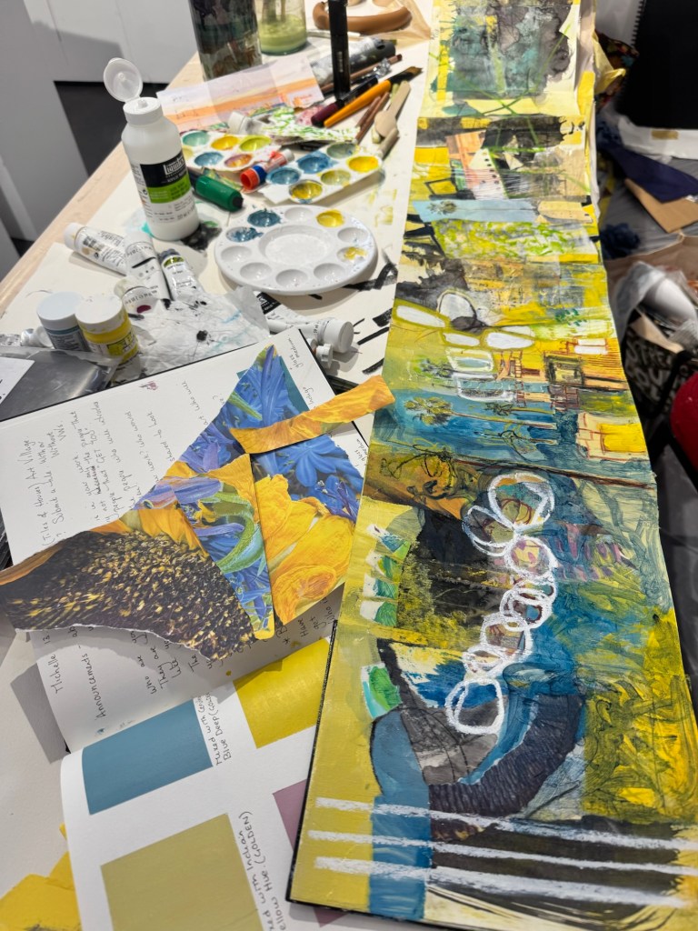 My process is intuitive and exploratory. I begin with marks, colours, and textures, allowing shapes and patterns to emerge naturally. Sketchbooks are essential—they capture fragments of memory, glimpses of ideas, and small experiments that often grow into paintings or stitched, tactile pieces.